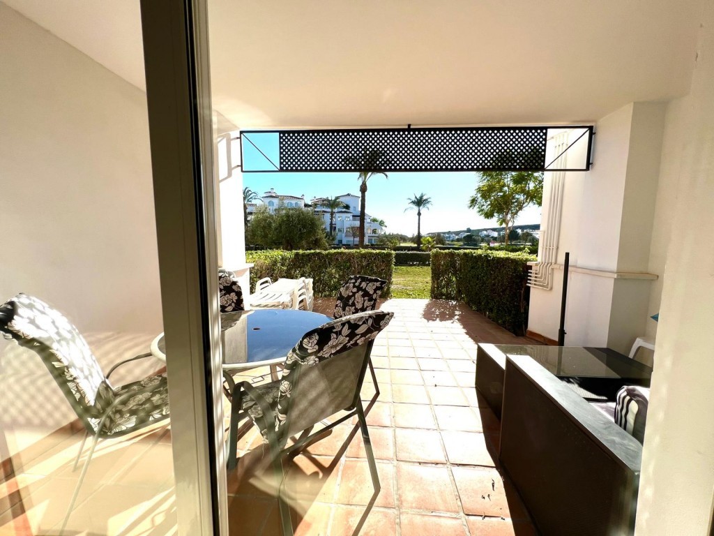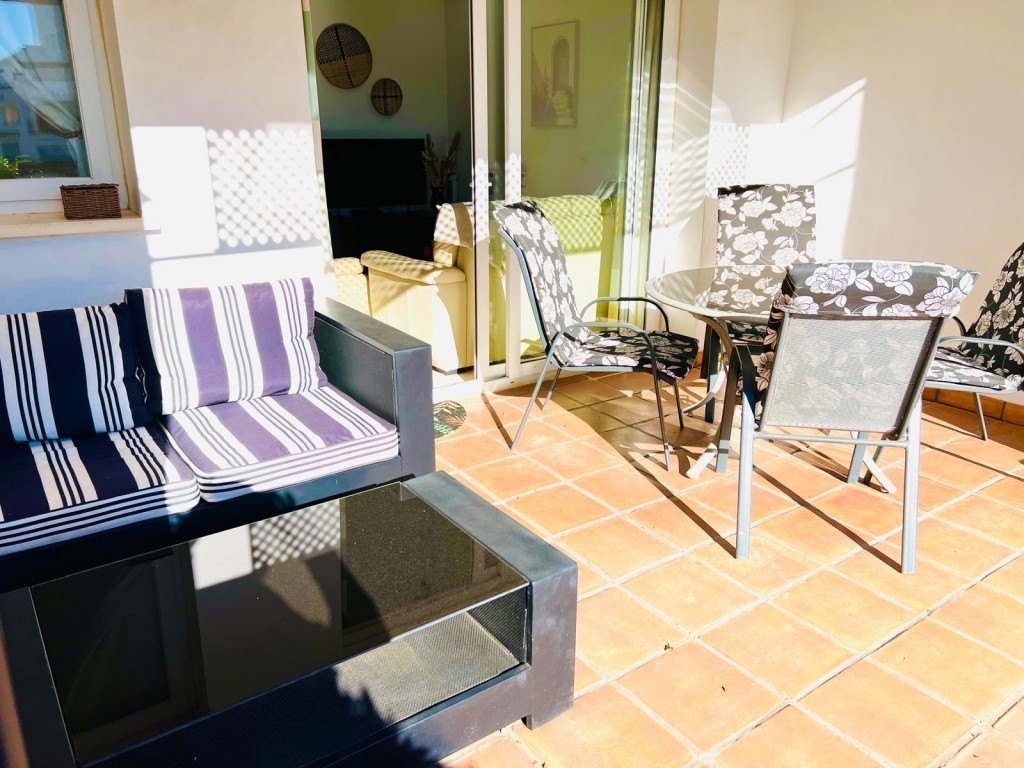 The bright and spacious living/dining area features air conditioning and is perfect for relaxing or entertaining. Large patio doors lead directly onto a generous, fully tiled private terrace, furnished for outdoor dining and lounging. With its south-facing orientation, the terrace enjoys sunshine throughout the year and overlooks the golf course.